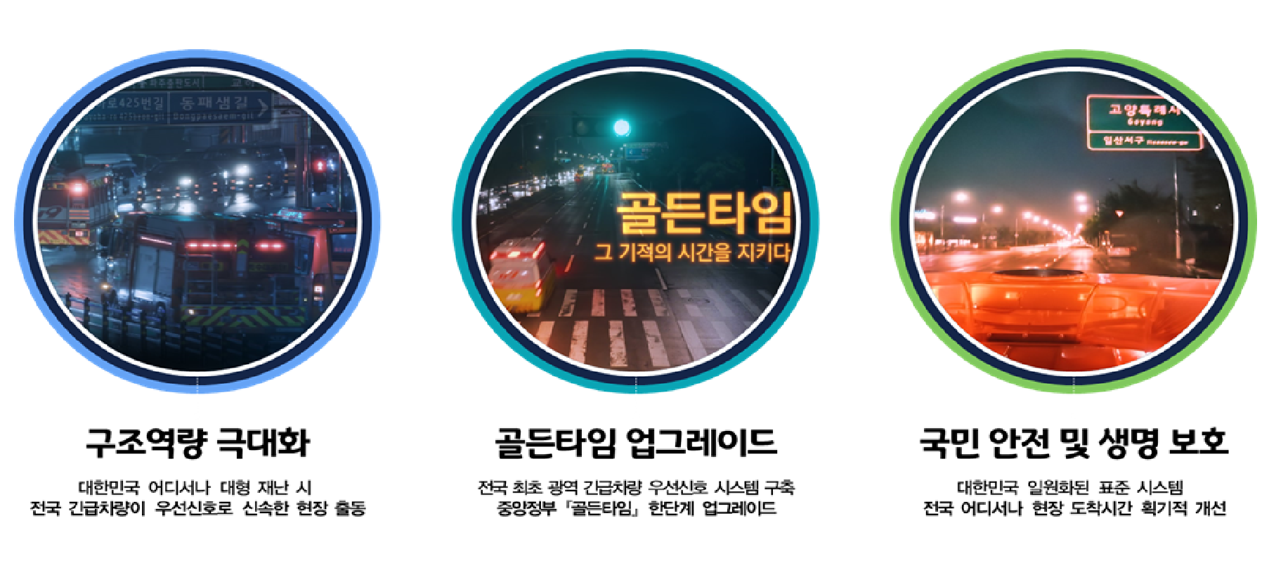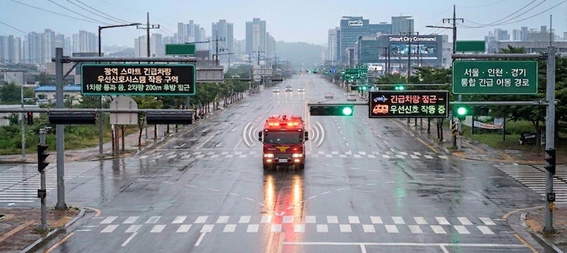 '광역 긴급차량 우선신호시스템'은 국민의 소중한 생명과 안전을 지키기 위해 긴급차량이 출동할 때 교통신호를 녹색신호로 자동으로 변경하는 시스템입니다.