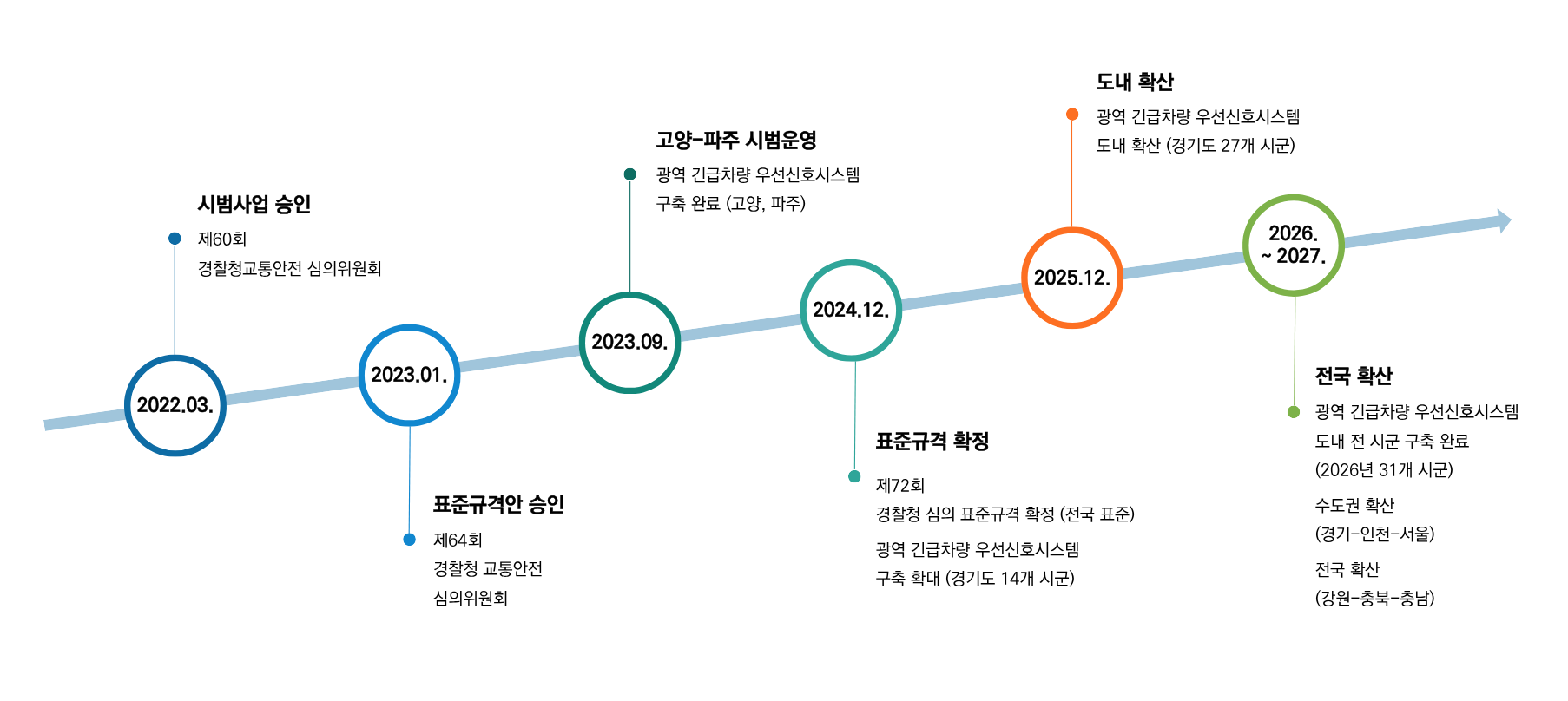 2022년 3월 경찰청 교통안전심의를 통해 시범사업 승인을 거쳐 2023년 1월 시범사업을 위한 표준 규격안 승인을 받았습니다. 2023년 9월 고양시 파주시를 대상으로 시범사업을 완료하여 2024년에는 14개 도시 2025년에는 27개 도시가 도입하였고, 2026년까지 31개 도시가 '광역 긴급차량 우선신호시스템'을 도입할 예정입니다.