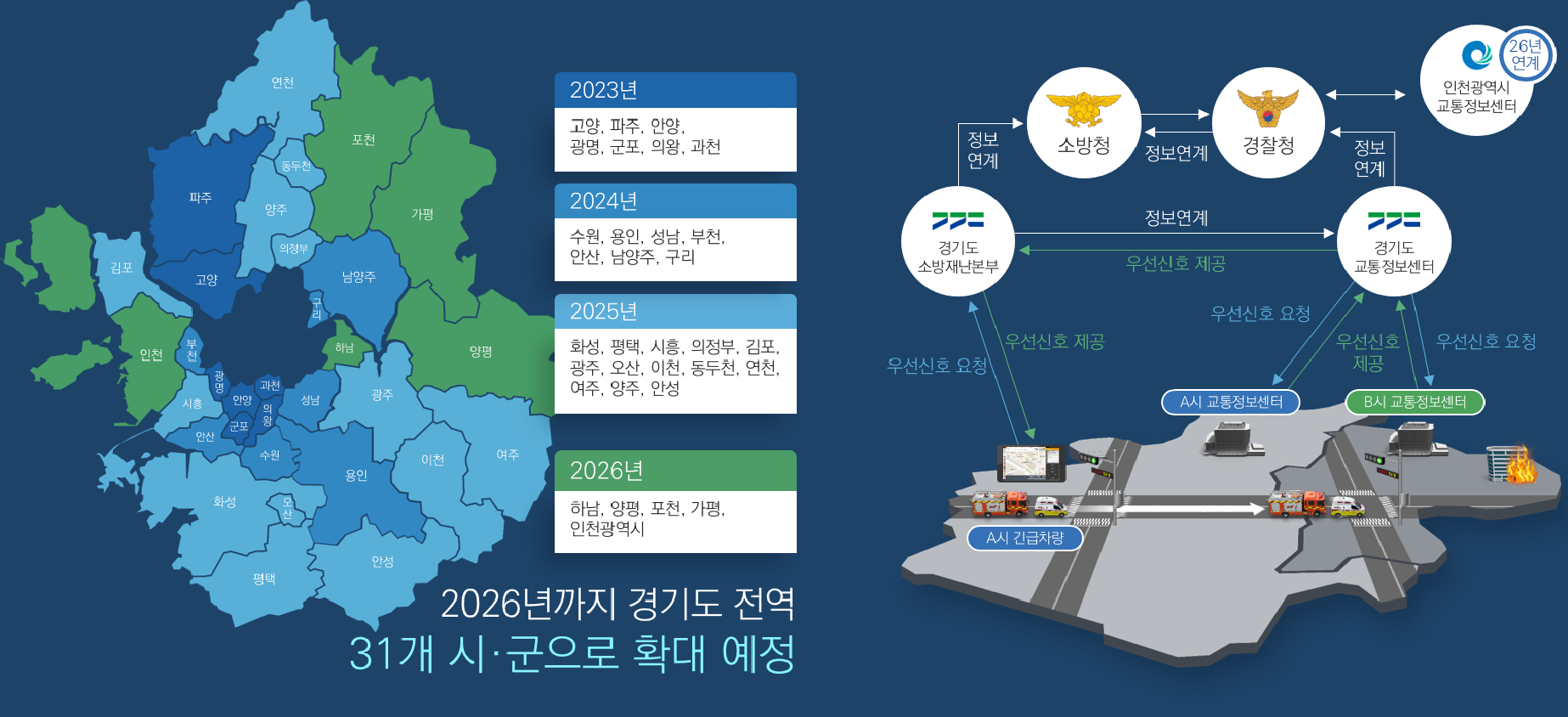 도시의 경계를 허무는 경기도의 비상대응플랫폼은 경기도 31개 도시 중 2개 도시를 시작으로 27개 도시로 확산되었고 2026년 말까지 31개 도시가 도입될 예정입니다. 이제는 지역도시뿐만 아니라 인천시를 시작으로 서울시, 강원도, 충청남도와의 연계사업을 추진하고 있어서 경기도의 혁신적인 응급대응 플랫폼인 '광역 긴급차량 우선신호시스템'은 지속적으로 확장 중입니다.