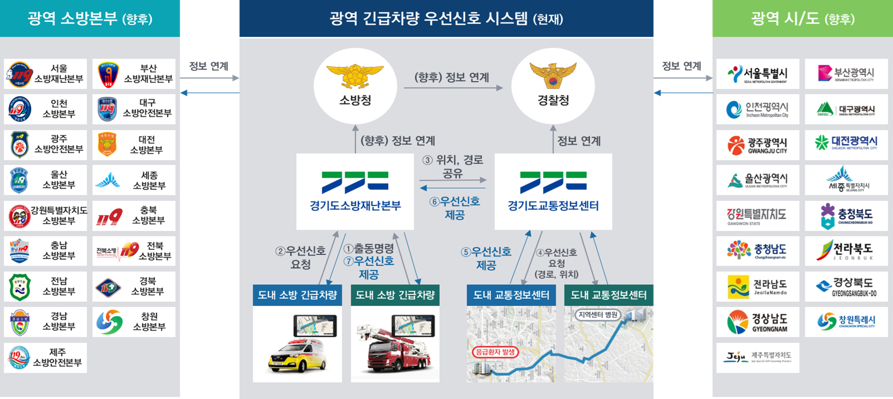 대한민국 재난응급체계를 하나로 묶기 위해, 경기도는 경찰청, 소방청과 함께 광역 긴급차량 우선신호시스템을 만들었습니다.