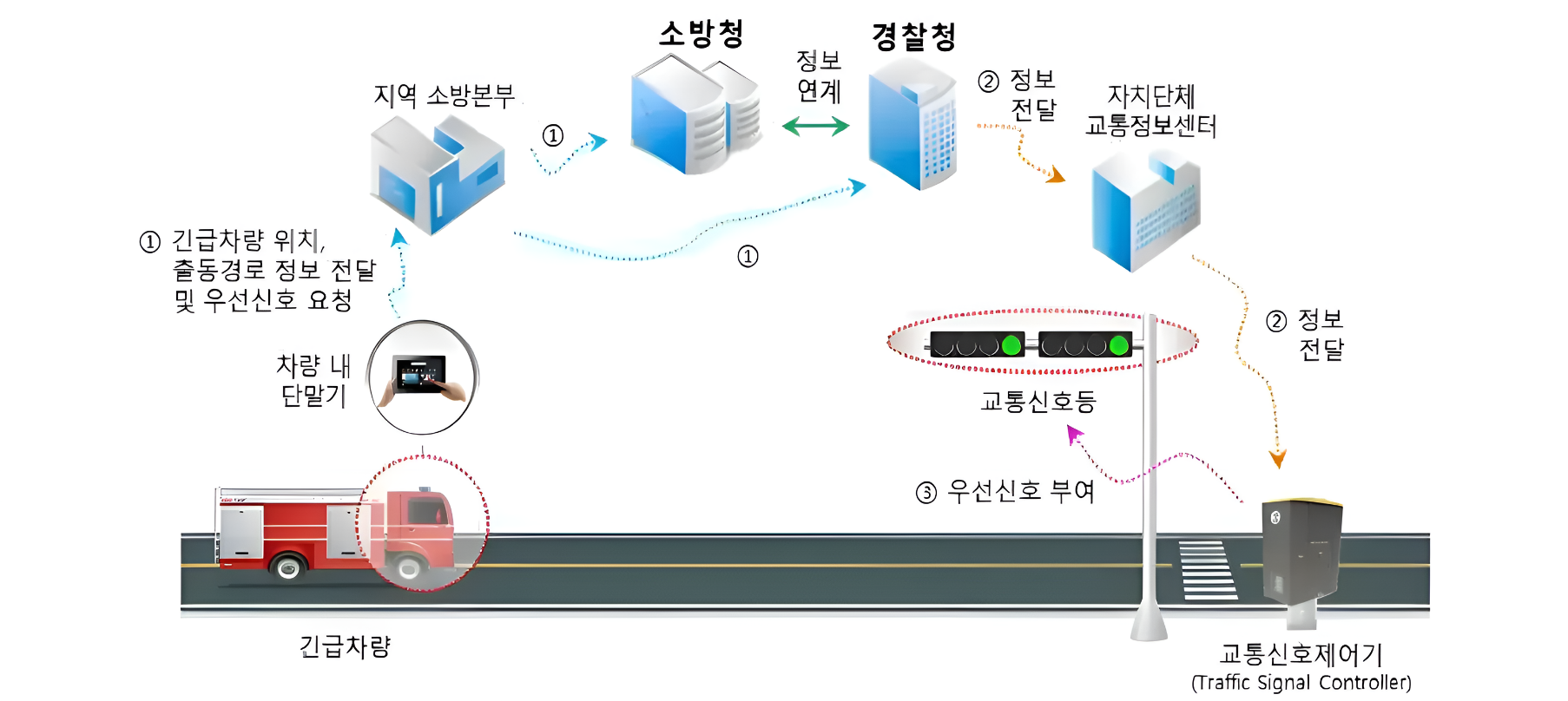 경찰청과 소방청(또는 지역 소방본부)이 연계되어 긴급차량의 위치, 출동경로, 우선 신호 요청 정보를 송·수신하여 시·도경계를 넘는 광역 출동 시에도 긴급차량이 진행 중인 경로상 교차로에 신호를 부여하는 시스템이다.